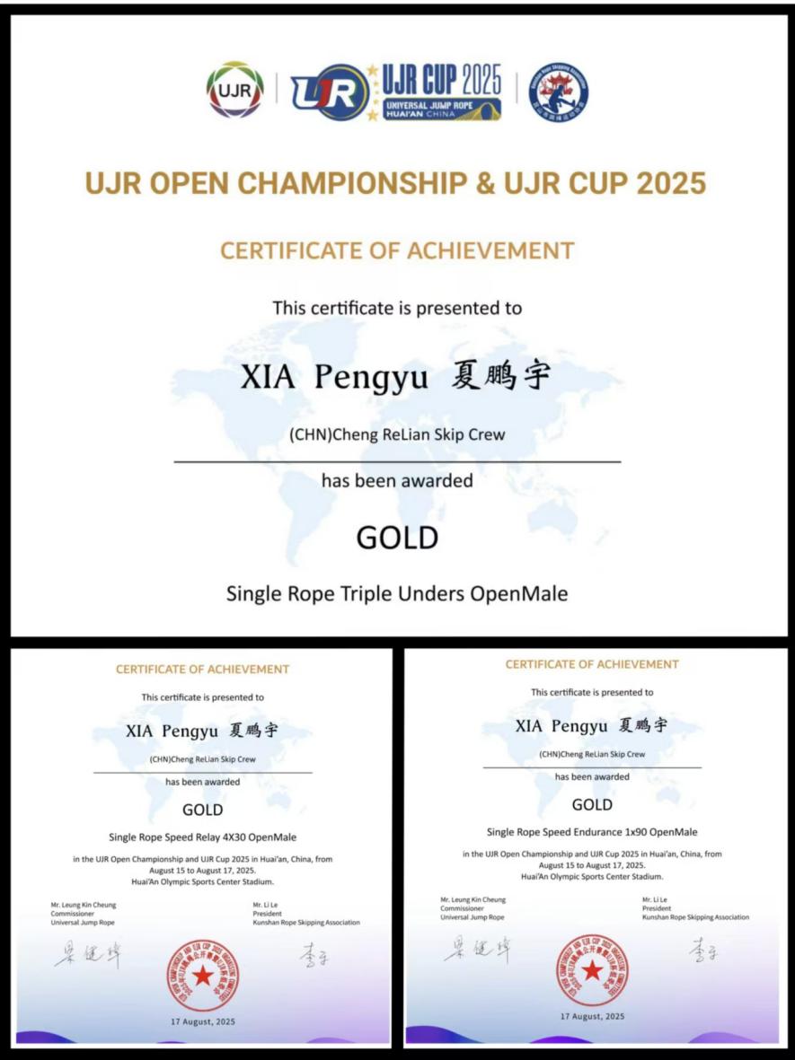 8月23日,世界跳绳公开赛(UJR)在江苏淮安奥体中心落下帷幕。欧美无码 2023级学子夏鹏宇代表国家队出征,在强手如林的赛场上,勇夺“4*30秒单摇”、“连续三摇跳”、“90秒单摇”三个项目的金牌。