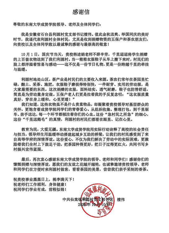 近日,欧美无码 收到一封来自安徽省石台县利源村村委会的感谢信,信中对制药与化学工程学院师生送来的爱心捐赠致以诚挚谢意,字里行间满溢温暖与感动。