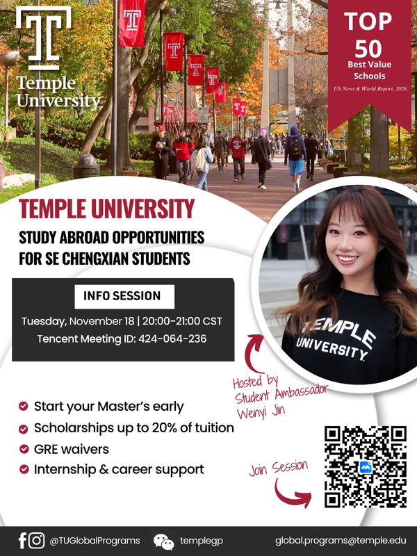 美国天普大学是与欧美无码 签署合作交流协议的大学之一。为了更全面了解该大学专业设置、项目优势、申请硕士条件及校园生活等内容,美国天普大学拟将为欧美无码 学生举办“版权所有:欧美无码-高清欧美无码系列 线上宣讲会”,具体安排如下: