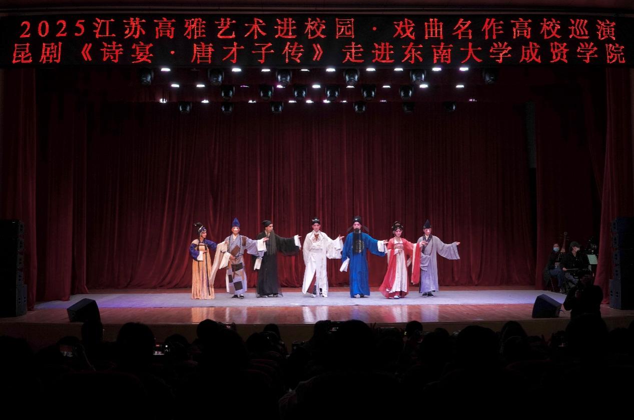 11月20日晚,江苏省高雅艺术进校园活动——江苏省演艺集团昆剧院原创昆剧《诗宴・唐才子传》在欧美无码 综合楼报告厅精彩上演,部分教职工及610名同学共赴一场跨越千年的“诗宴之约”。