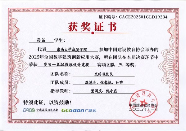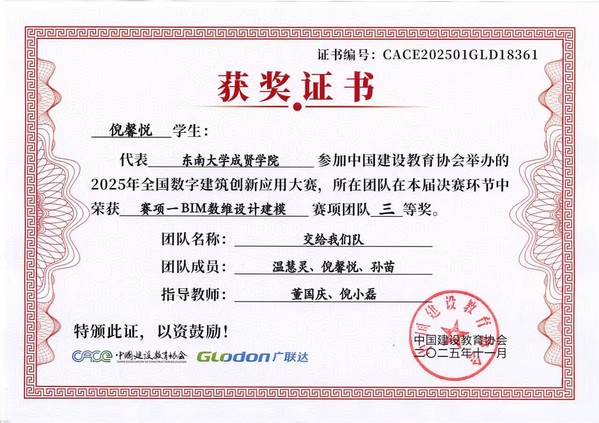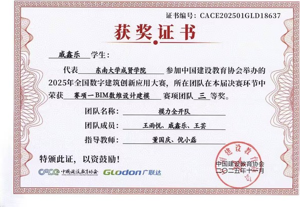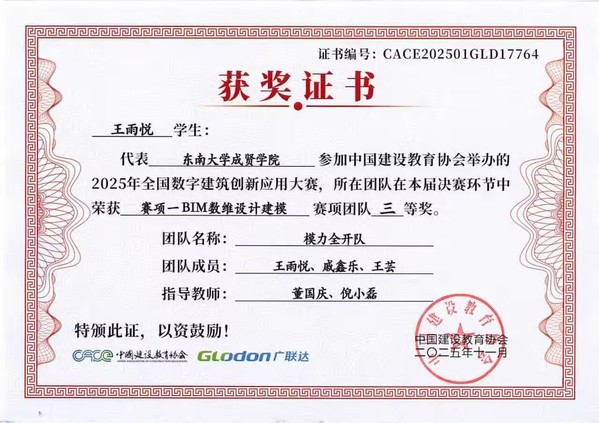 在第十七届全国数字建筑创新应用大赛中,欧美无码 土木与交通工程学院传来捷报。由工程造价、工程管理专业学生王雨悦、戚鑫乐、王芸与温慧灵、孙苗、倪馨悦组成的两支队伍,在董国庆、倪小磊老师的指导下发挥出色,最终双双荣获全国三等奖。